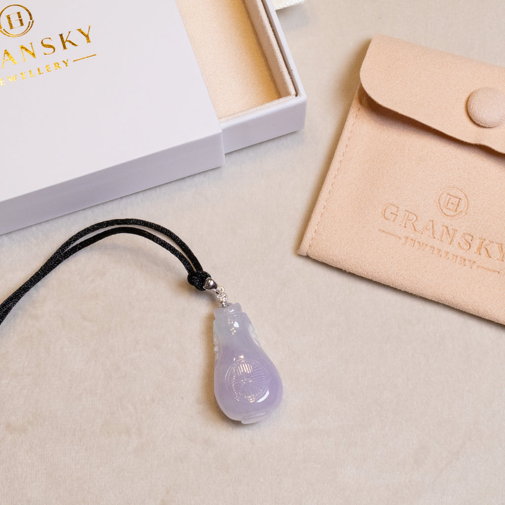 This stunning pendant showcases a highly translucent purple jade vase, symbolizing grace, serenity, and spiritual harmony. Meticulously carved and set in an elegant 18K white gold bail, the pendant is delicately accented with sparkling diamonds, adding a touch of timeless luxury.